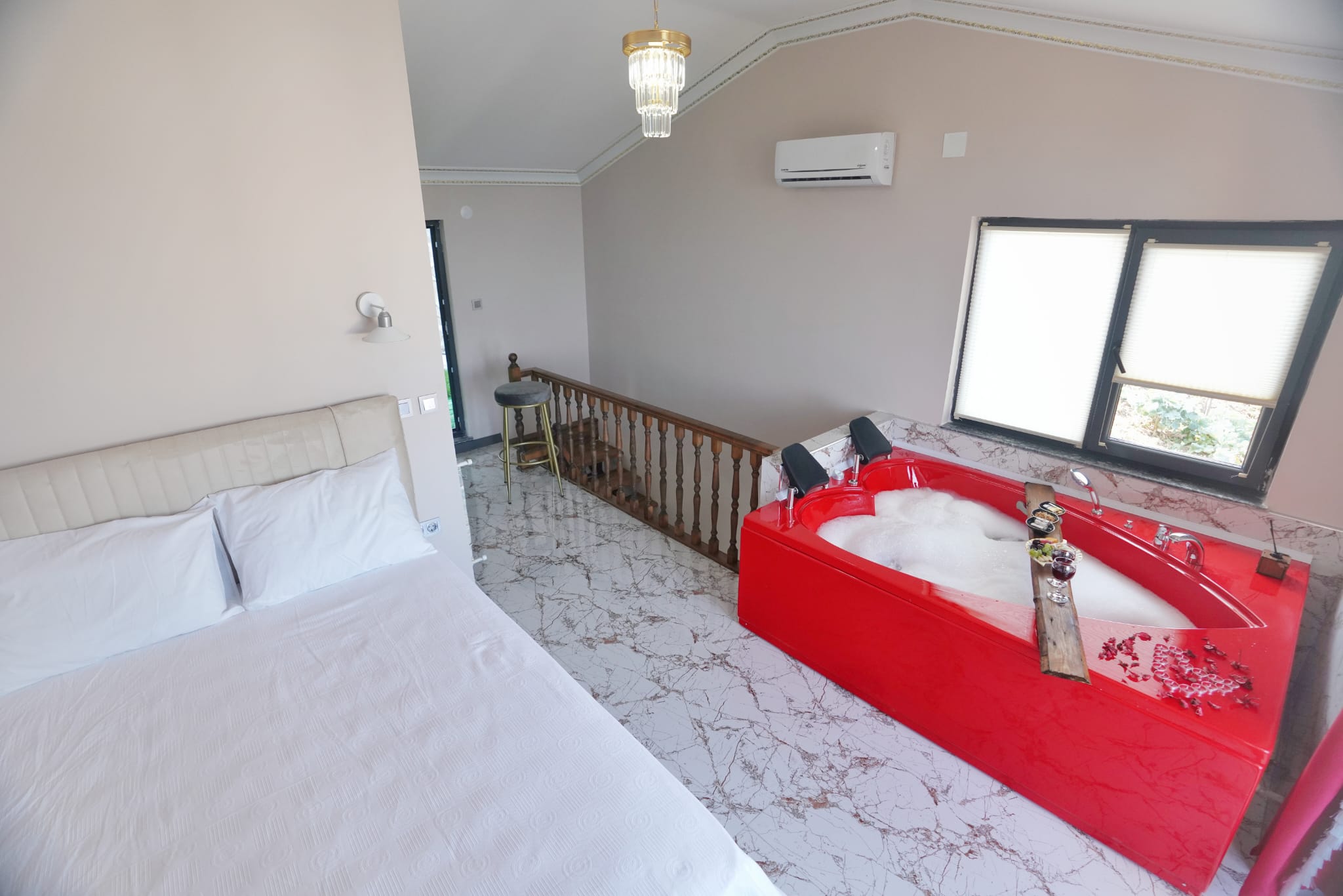 Jakuzi, duşa kabin, 3 banyo ve 4 WC ile konforlu banyo deneyimi. Saç kurutma makinesi ve havlu dahil.